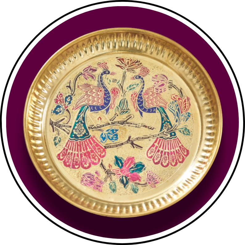 Brass Meenakari Etched Plate – 3cm | Embossed Peacock & Floral Design | Ideal for Serving Sweets, Fruits & Bhog Offerings